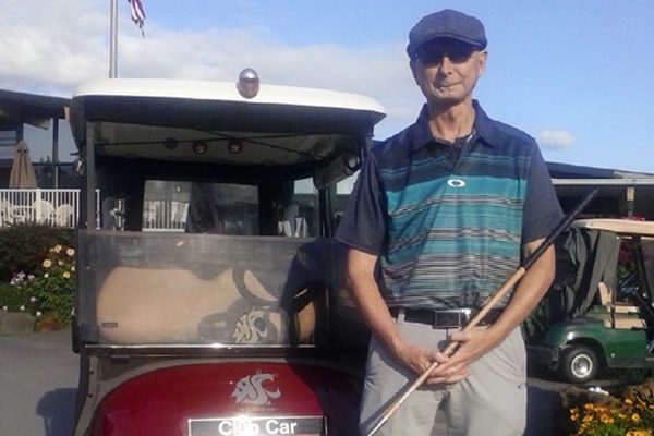 Tom: What is personally amazing to me is that a number of today’s club designs have been reused for over 100 years. Granted the materials and manufacturing methods have changed but the overall concept of rear weighting has been used since before the 1900’s. Many hickory woods of the day have rear and perimeter weighting to lower the Center of Gravity (COG) of the head and make the head more durable. Today’s marketing makes it seem like it’s a new concept but the club designers back in the day were already aware of the virtues of lowering the COG. For example my Brassie (13 degree, 3 wood), my Baffie (16 degree, 2 hybrid, 105 yrs old), my Cleek (22 degree, 5 wood) have combinations of metal base plates and rear weighting. Tom Kennedy with a hickory in hand and his WSU Cougar golf cart at Linden G&CC (photo by The Hickory Corner)