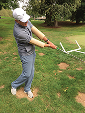 Imagine you have casts on your arms: (photo 1 and 2) and just turn your triangle of your two arms and chest back and through. Remember always start left and finish left. Its like your chest is the hub of the wagon wheel and your arms are the spokes. Keep it moving. Less hinge, less folding of your arms.